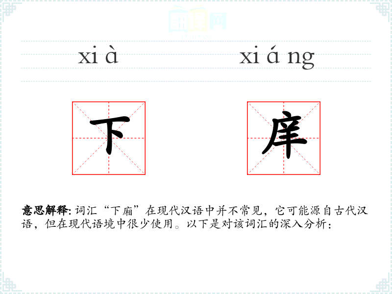 词汇“下廂”在现代汉语中并不常见,它可能源自古代汉语,但在现代语境中很少使用。以下是对该词汇的深入分析: