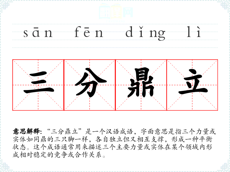 “三分鼎立”源自**古代的鼎,鼎有三只脚,象征着稳定和平衡。这个成语在历史上多用于描述三国时期的政治格局,后来逐渐泛指任何三个主要力量或实体的平衡状态。