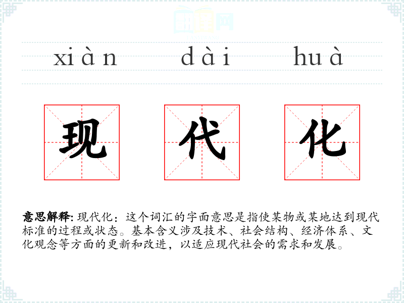 现代化:这个词汇的字面意思是指使某物或某地达到现代标准的过程或状态。基本含义涉及技术、社会结构、经济体系、文化观念等方面的更新和改进,以适应现代社会的需求和发展。