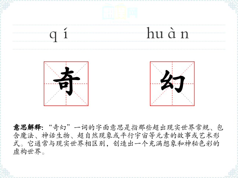 “奇幻”一词的字面意思是指那些超出现实世界常规、包含魔法、神话生物、超自然现象或平行宇宙等元素的故事或艺术形式。它通常与现实世界相区别,创造出一个充满想象和神秘色彩的虚构世界。