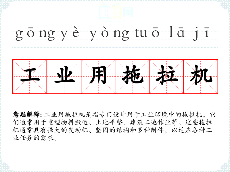 在不同语言中,如英语中的“industrial tractor”和德语中的“Industrie-Traktor”,虽然词汇不同,但都指代类似的工业设备。