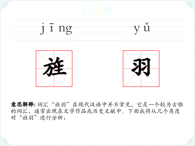 “旌羽”字面意思是指装饰有羽毛的旗帜。其中,“旌”指的是一种古代的旗帜,而“羽”则是指鸟类的羽毛。在古代,旌羽常用于军事或仪式中,象征着权威和尊贵。