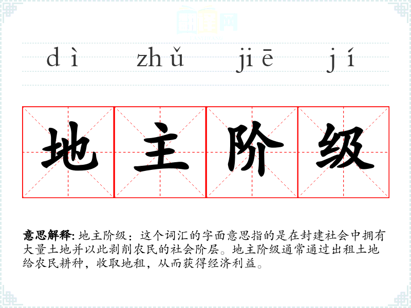 地主阶级:这个词汇的字面意思指的是在封建社会中拥有大量土地并以此剥削农民的社会阶层。地主阶级通常通过出租土地给农民耕种,收取地租,从而获得经济利益。