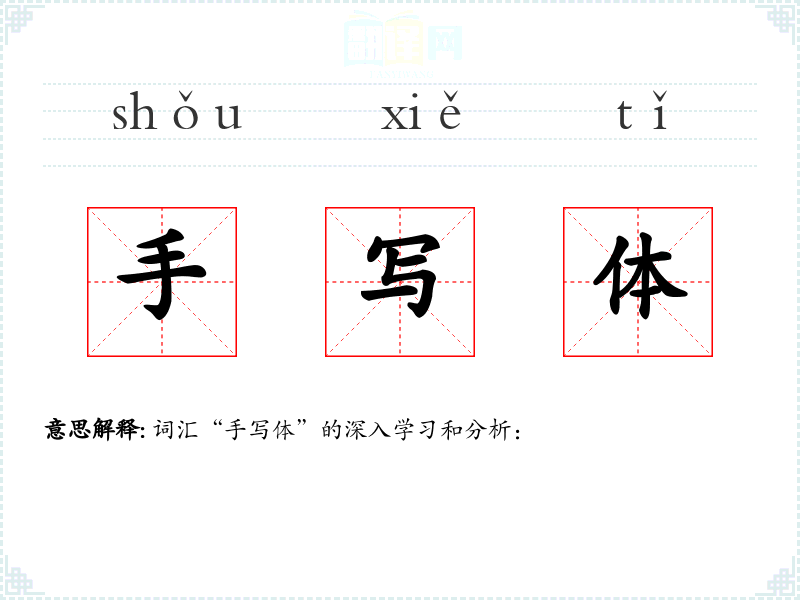 “手写体”指的是通过手写方式创造的文字风格或字体。它与印刷体相对,强调个人书写习惯和风格,可以是正式的书法,也可以是日常的笔记。