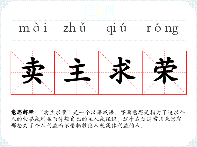 “卖主求荣”是一个汉语成语,字面意思是指为了追求个人的荣誉或利益而背叛自己的主人或组织。这个成语通常用来形容那些为了个人利益而不惜牺牲他人或集体利益的人。