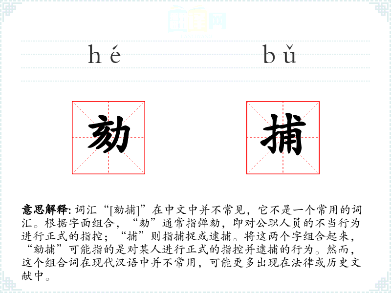 - “劾捕”是一个具有特定历史和文化背景的词汇,虽然在现代汉语中不常用,但在特定的语境下,它能够准确地传达出正式指控和逮捕的含义。了解这样的词汇有助于丰富语言知识,增强对特定领域语言的理解。