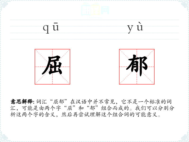 词汇“屈郁”在汉语中并不常见,它不是一个标准的词汇,可能是由两个字“屈”和“郁”组合而成的。我们可以分别分析这两个字的含义,然后再尝试理解这个组合词的可能意义。