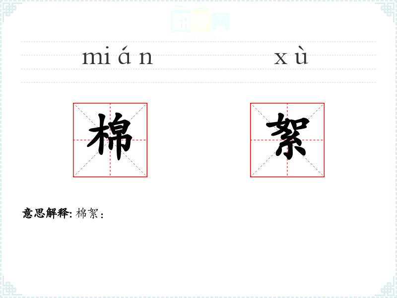- 词源:棉絮一词源于汉语,由“棉”和“絮”两个字组成,分别指棉花和细碎的纤维。