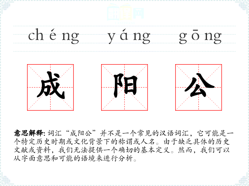 词汇“成阳公”并不是一个常见的汉语词汇,它可能是一个特定历史时期或文化背景下的称谓或人名。由于缺乏具体的历史文献或资料,我们无法提供一个确切的基本定义。然而,我们可以从字面意思和可能的语境来进行分析。