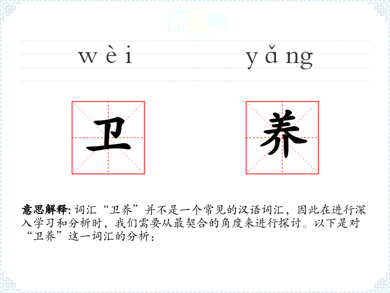 由于“卫养”不是一个标准词汇,我们可以尝试从字面意思来解释: