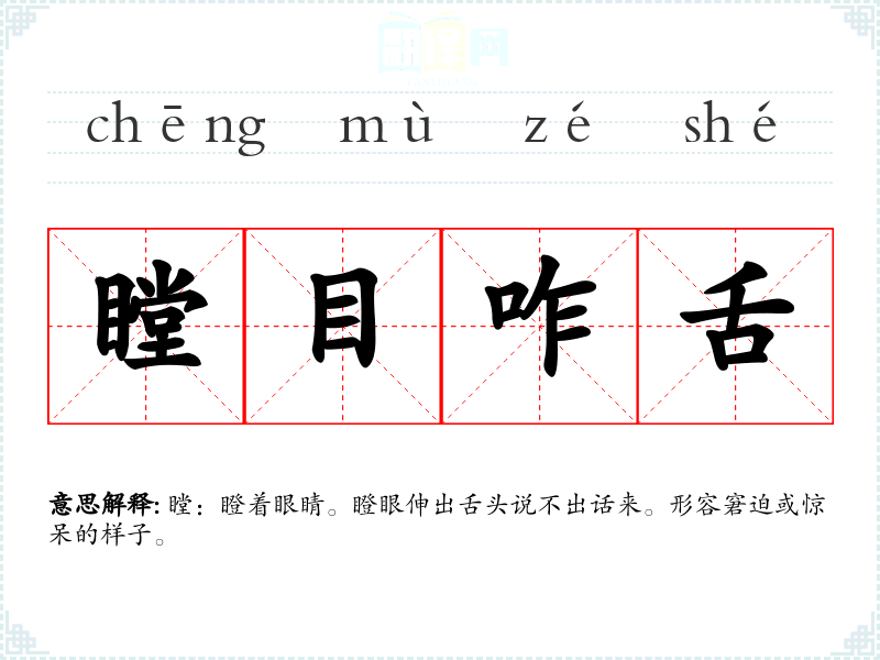 瞠:瞪着眼睛。瞪眼伸出舌头说不出话来。形容窘迫或惊呆的样子。