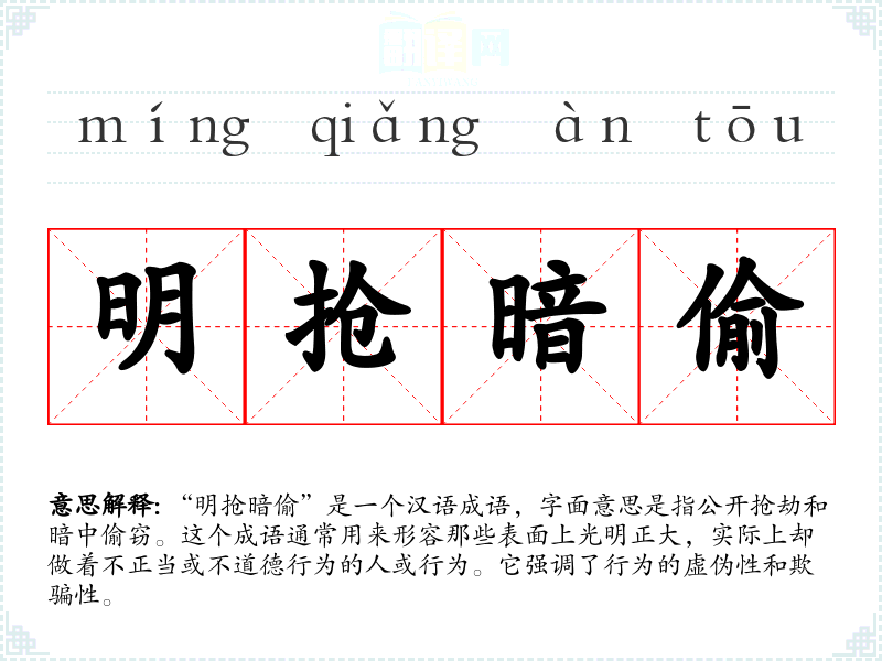 “明抢暗偷”是一个汉语成语,字面意思是指公开抢劫和暗中偷窃。这个成语通常用来形容那些表面上光明正大,实际上却做着不正当或不道德行为的人或行为。它强调了行为的虚伪性和欺骗性。