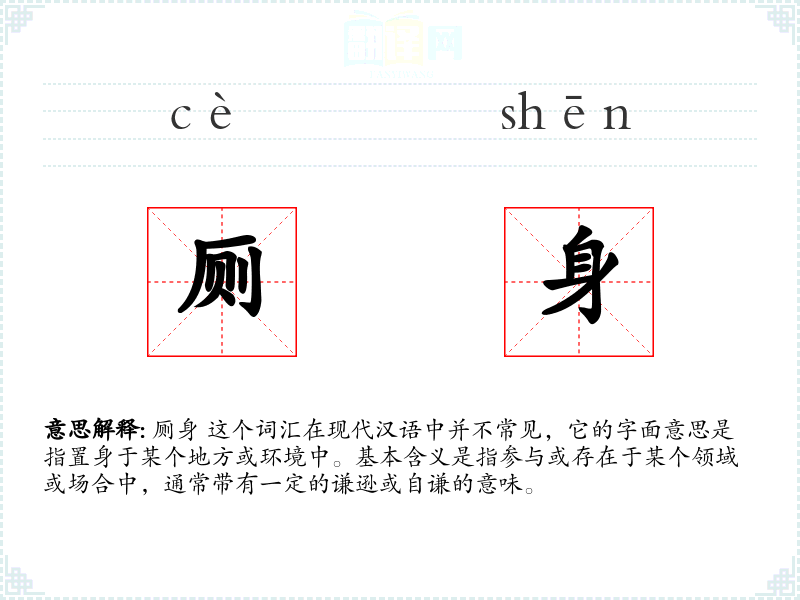 厕身 这个词汇在现代汉语中并不常见,它的字面意思是指置身于某个地方或环境中。基本含义是指参与或存在于某个领域或场合中,通常带有一定的谦逊或自谦的意味。