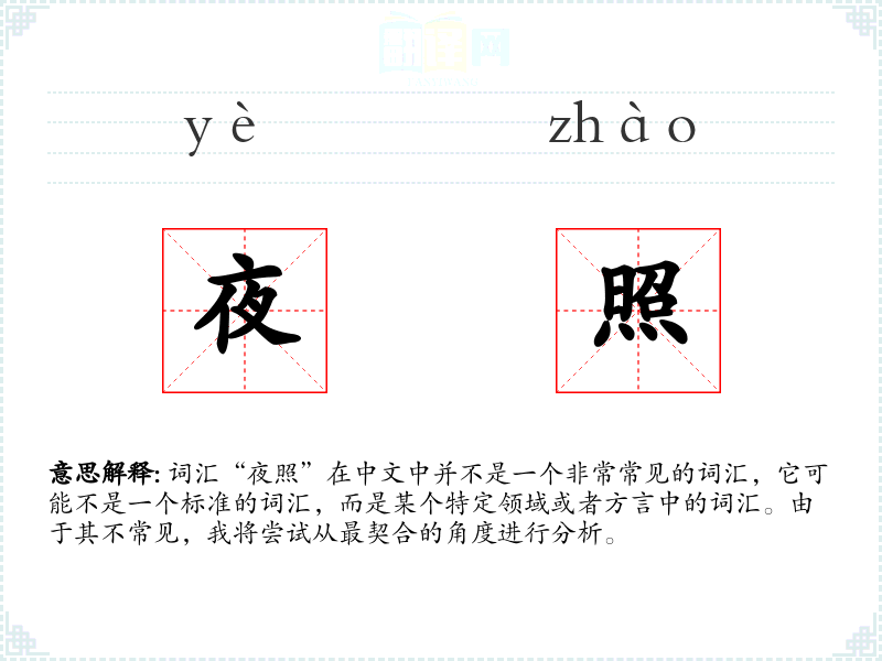 由于“夜照”不是一个标准词汇,它在不同语境下的使用可能非常有限。在某些方言或者特定领域(如摄影、航海、军事等)中,它可能有特定的含义。
