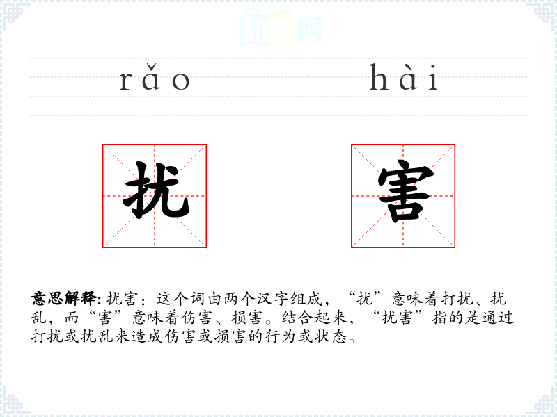 扰害:这个词由两个汉字组成,“扰”意味着打扰、扰乱,而“害”意味着伤害、损害。结合起来,“扰害”指的是通过打扰或扰乱来造成伤害或损害的行为或状态。