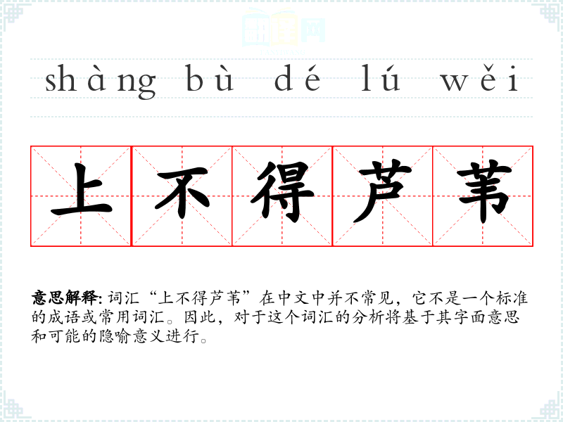 词汇“上不得芦苇”在中文中并不常见,它不是一个标准的成语或常用词汇。因此,对于这个词汇的分析将基于其字面意思和可能的隐喻意义进行。