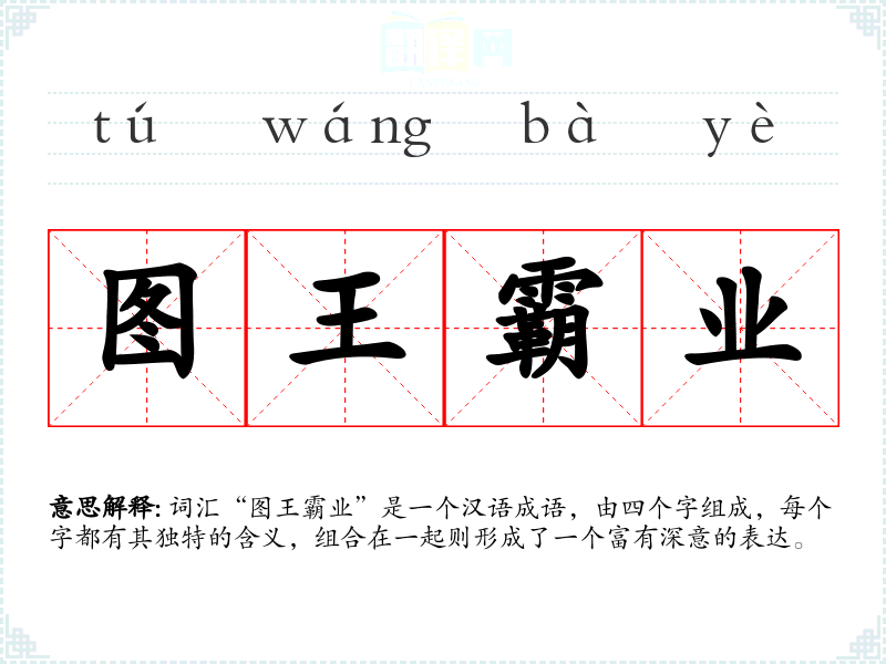词汇“图王霸业”是一个汉语成语,由四个字组成,每个字都有其独特的含义,组合在一起则形成了一个富有深意的表达。