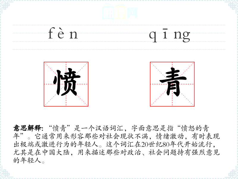 “愤青”是一个汉语词汇,字面意思是指“愤怒的青年”。它通常用来形容那些对社会现状不满,情绪激动,有时表现出极端或激进行为的年轻人。这个词汇在20世纪80年代开始流行,尤其是在**大陆,用来描述那些对政治、社会问题持有强烈意见的年轻人。