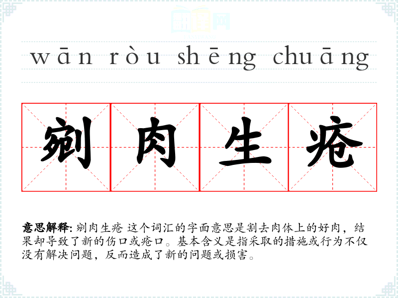 剜肉生疮 这个词汇的字面意思是割去肉体上的好肉,结果却导致了新的伤口或疮口。基本含义是指采取的措施或行为不仅没有解决问题,反而造成了新的问题或损害。