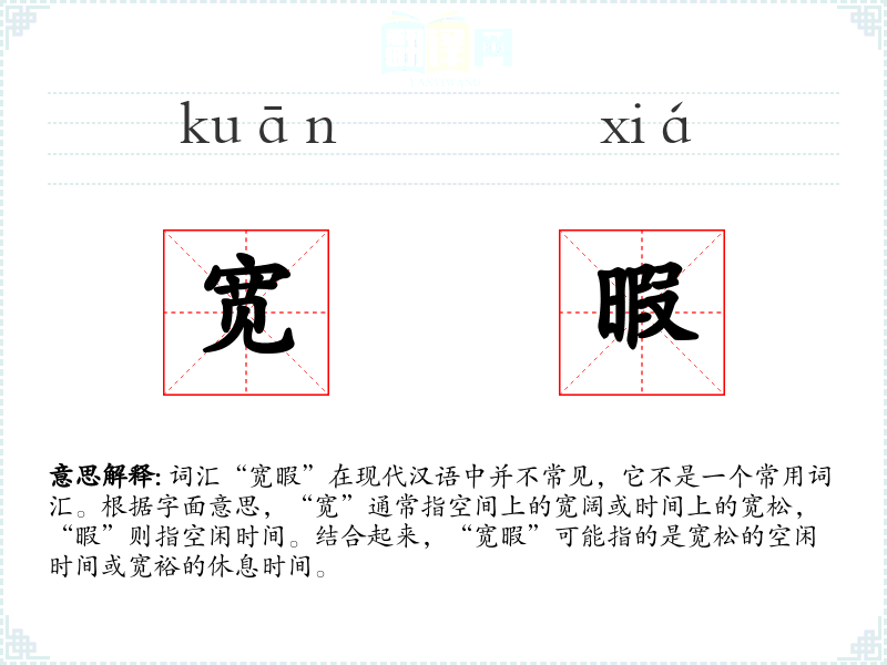 - “宽”和“暇”都是古代汉语词汇,组合成“宽暇”可能在古代文献中有所体现,但在现代汉语中使用较少。