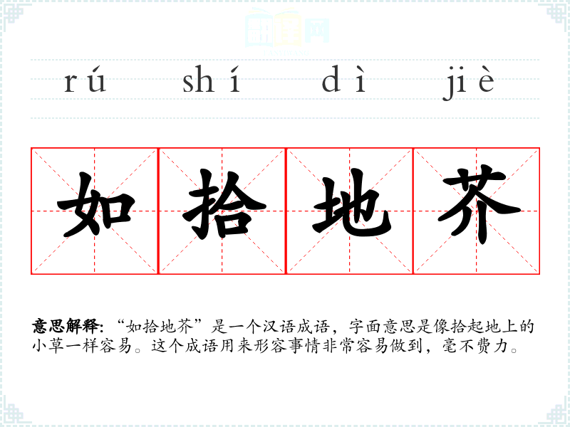 “如拾地芥”是一个汉语成语,字面意思是像拾起地上的小草一样容易。这个成语用来形容事情非常容易做到,毫不费力。