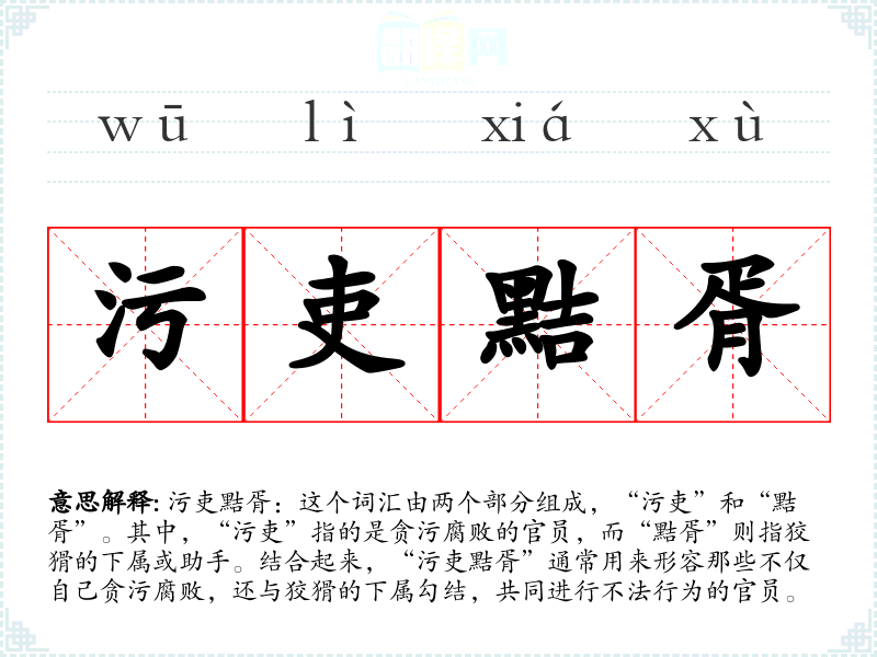 污吏黠胥:这个词汇由两个部分组成,“污吏”和“黠胥”。其中,“污吏”指的是贪污腐败的官员,而“黠胥”则指狡猾的下属或助手。结合起来,“污吏黠胥”通常用来形容那些不仅自己贪污腐败,还与狡猾的下属勾结,共同进行不法行为的官员。