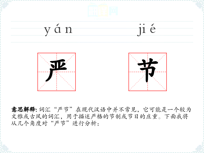 词汇“严节”在现代汉语中并不常见,它可能是一个较为文雅或古风的词汇,用于描述严格的节制或节日的庄重。下面我将从几个角度对“严节”进行分析: