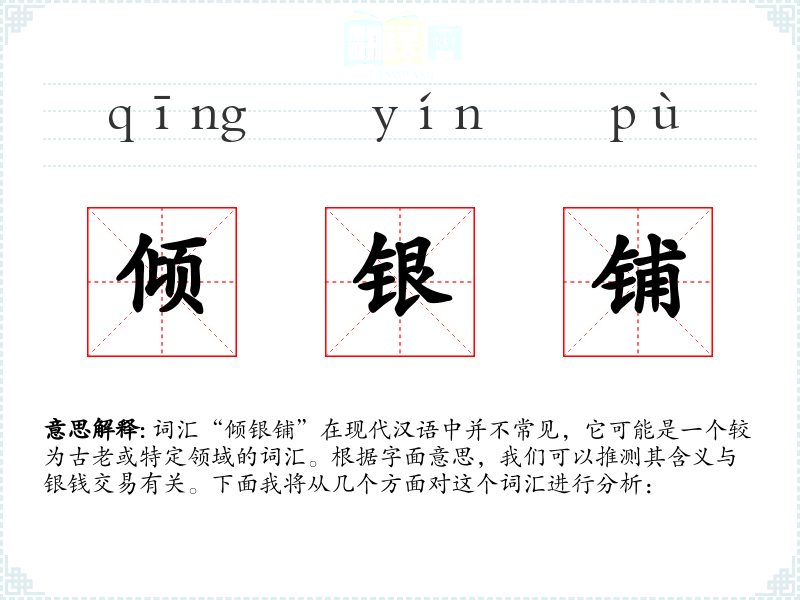 词汇“倾银铺”在现代汉语中并不常见,它可能是一个较为古老或特定领域的词汇。根据字面意思,我们可以推测其含义与银钱交易有关。下面我将从几个方面对这个词汇进行分析: