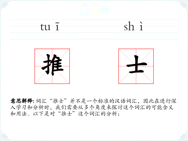 词汇“推士”并不是一个标准的汉语词汇,因此在进行深入学习和分析时,我们需要从多个角度来探讨这个词汇的可能含义和用法。以下是对“推士”这个词汇的分析: