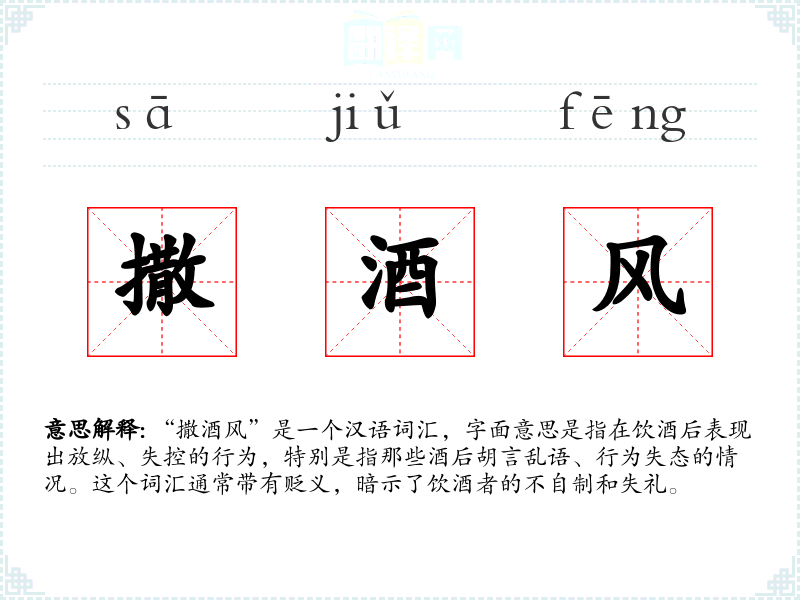 “撒酒风”是一个汉语词汇,字面意思是指在饮酒后表现出放纵、失控的行为,特别是指那些酒后胡言乱语、行为失态的情况。这个词汇通常带有贬义,暗示了饮酒者的不自制和失礼。