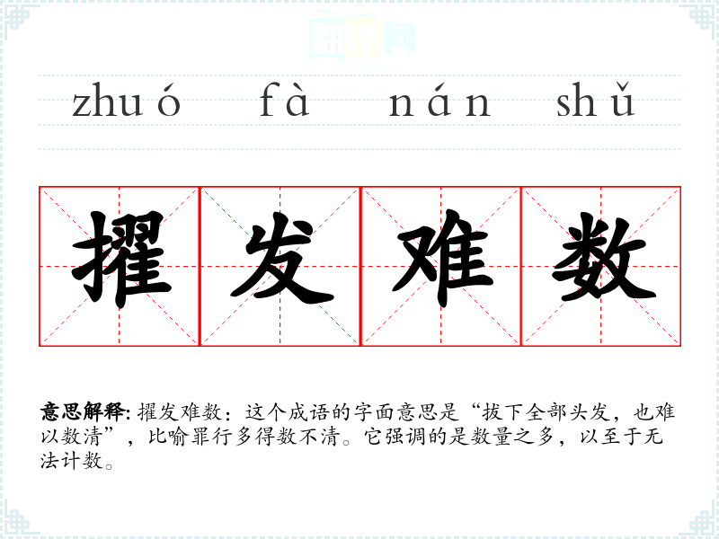 总结:擢发难数是一个富有文化内涵的成语,它不仅形象地描述了数量之多,还带有强烈的道德和法律警示意味。 反思:在语言学*和表达中,理解和正确使用这样的成语可以增强语言的表达力和文化深度。