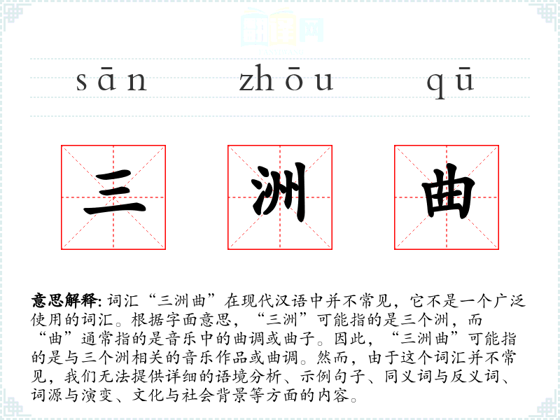 总结来说,“三洲曲”这个词汇在现代汉语中并不常见,缺乏足够的信息来进行深入的分析和探讨。如果你有更多的背景信息或者是在特定的文学作品、音乐作品中遇到这个词汇,我们可以进一步探讨其具体含义和用法。