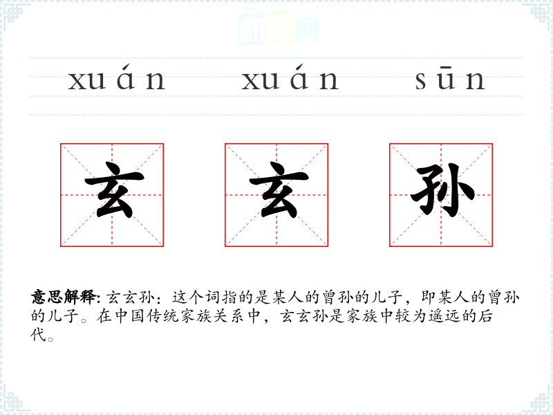 玄玄孙这个词可能让人联想到家族的连续性和历史的深远。它可能唤起一种对家族传统的尊重和对未来的希望。