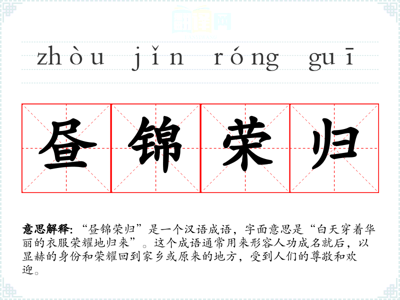 “昼锦荣归”源自**古代的文化背景,特别是在科举制度下,士人通过考试成为官员后,往往会回到家乡,受到乡亲们的尊敬。这个成语反映了古代社会对功成名就者的尊重和期待。