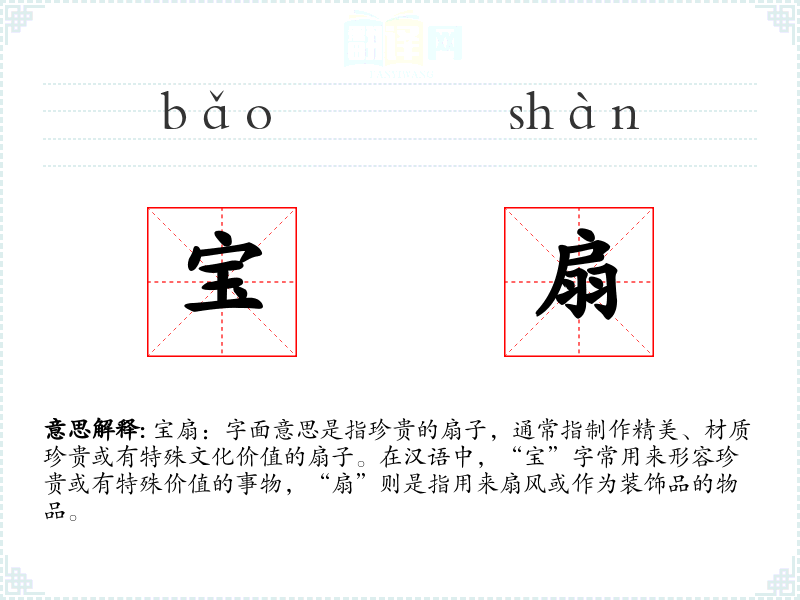 词源:“宝”字源自古代对珍贵物品的称呼,“扇”字则源自古代的扇风工具。