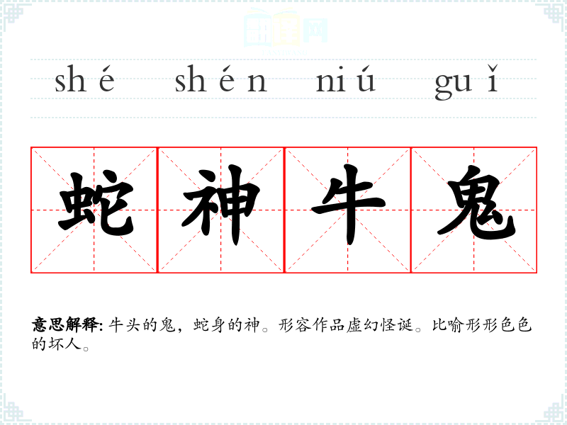牛头的鬼,蛇身的神。形容作品虚幻怪诞。比喻