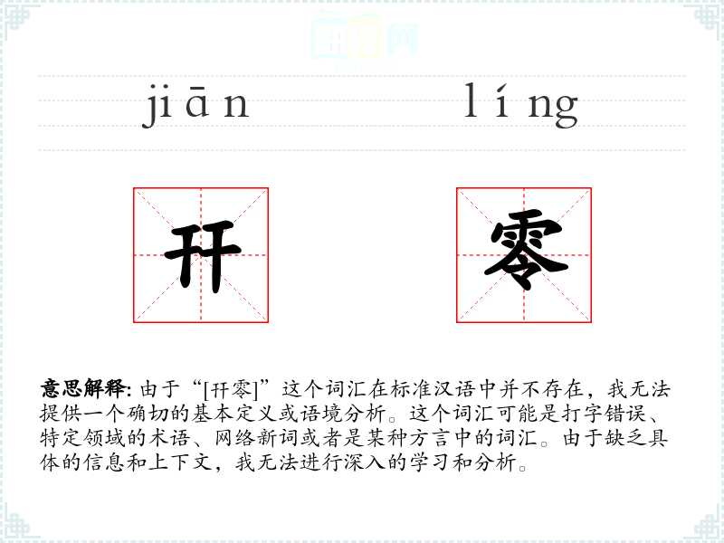 由于“[幵零]”这个词汇在标准汉语中并不存在,我无法提供一个确切的基本定义或语境分析。这个词汇可能是打字错误、特定领域的术语、网络新词或者是某种方言中的词汇。由于缺乏具体的信息和上下文,我无法进行深入的学习和分析。