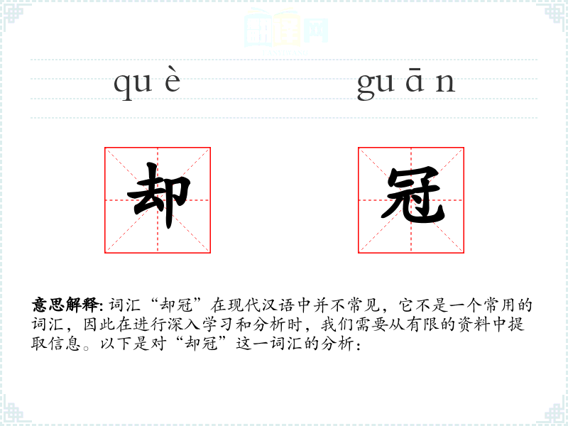 词汇“却冠”在现代汉语中并不常见,它不是一个常用的词汇,因此在进行深入学*和分析时,我们需要从有限的资料中提取信息。以下是对“却冠”这一词汇的分析: