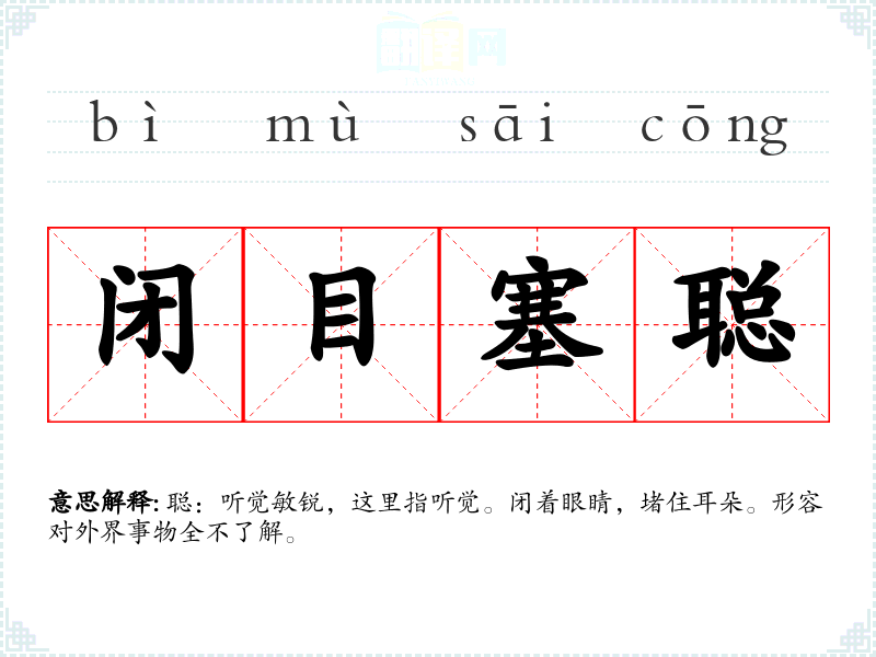 聪:听觉敏锐,这里指听觉。闭着眼睛,堵住耳朵。形容对外界事物全不了解。