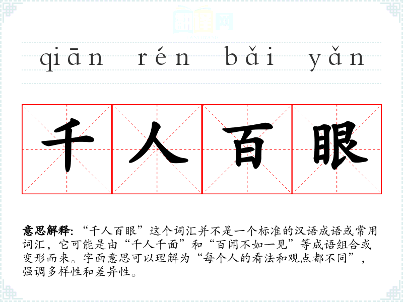 由于“千人百眼”不是一个常用词汇,它在不同语境下的使用可能较为有限。在文学作品中,可能会用来形容人们对同一事物的不同看法或评价;在口语中,可能用来表达对某件事情的多样性观点或个人感受的差异。