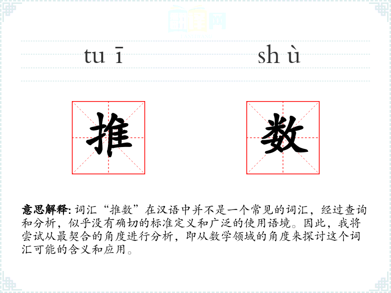 词汇“推数”在汉语中并不是一个常见的词汇,经过查询和分析,似乎没有确切的标准定义和广泛的使用语境。因此,我将尝试从最契合的角度进行分析,即从数学领域的角度来探讨这个词汇可能的含义和应用。