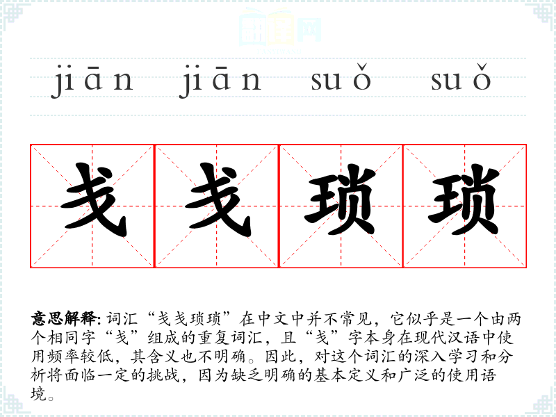词汇“戋戋琐琐”在中文中并不常见,它似乎是一个由两个相同字“戋”组成的重复词汇,且“戋”字本身在现代汉语中使用频率较低,其含义也不明确。因此,对这个词汇的深入学习和分析将面临一定的挑战,因为缺乏明确的基本定义和广泛的使用语境。