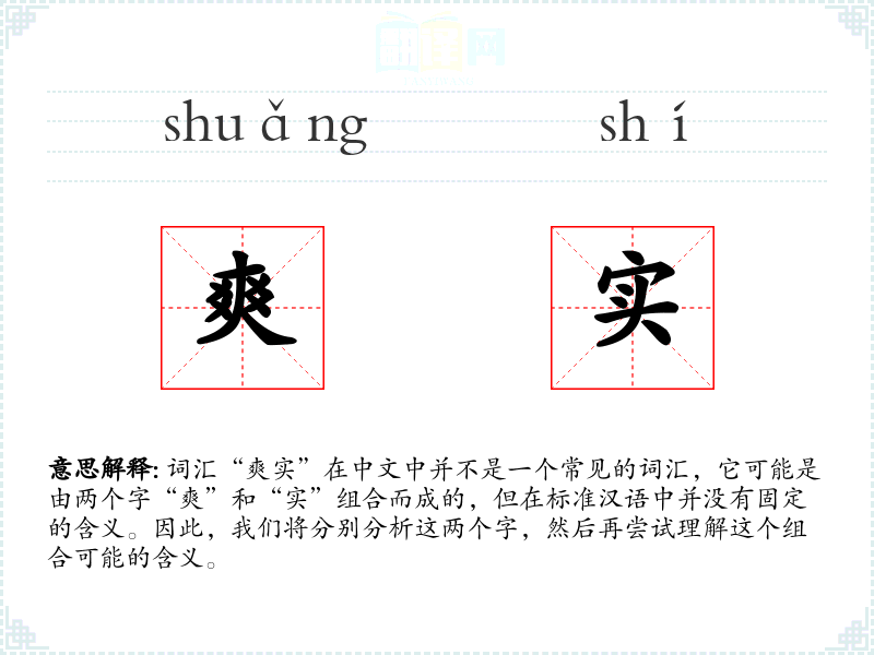 词汇“爽实”在中文中并不是一个常见的词汇,它可能是由两个字“爽”和“实”组合而成的,但在标准汉语中并没有固定的含义。因此,我们将分别分析这两个字,然后再尝试理解这个组合可能的含义。