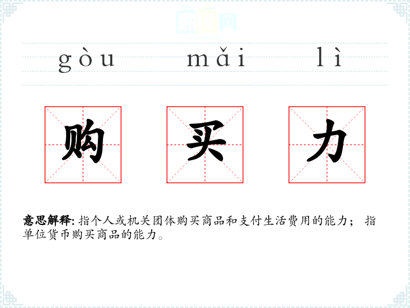 指个人或机关团体购买商品和支付生活费用的能力; 指单位货币购买商品的能力。