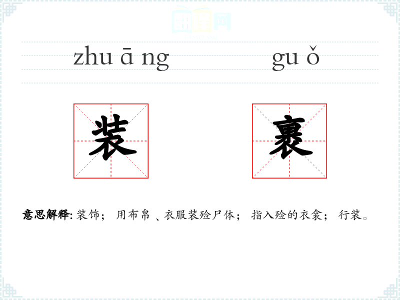 装饰; 用布帛﹑衣服装殓尸体; 指入殓的衣衾; 行装。