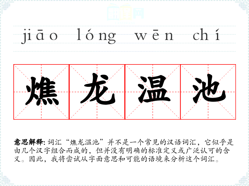词汇“燋龙温池”并不是一个常见的汉语词汇,它似乎是由几个汉字组合而成的,但并没有明确的标准定义或广泛认可的含义。因此,我将尝试从字面意思和可能的语境来分析这个词汇。