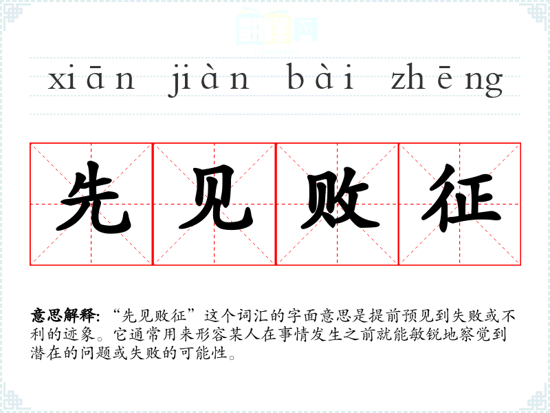 “先见败征”这个词汇的字面意思是提前预见到失败或不利的迹象。它通常用来形容某人在事情发生之前就能敏锐地察觉到潜在的问题或失败的可能性。