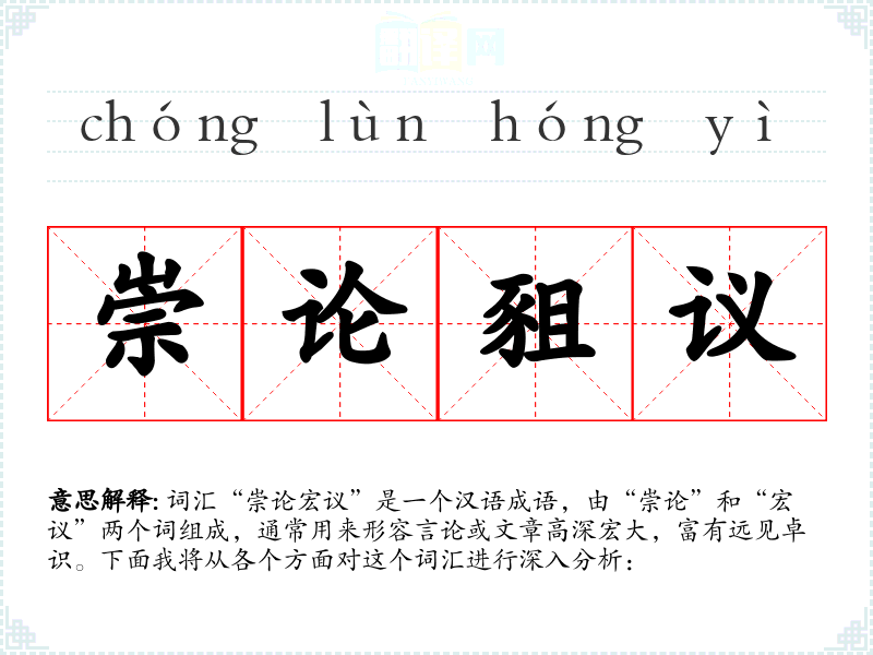 词汇“崇论宏议”是一个汉语成语,由“崇论”和“宏议”两个词组成,通常用来形容言论或文章高深宏大,富有远见卓识。下面我将从各个方面对这个词汇进行深入分析: