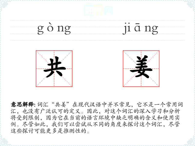 由于“共姜”不是一个标准词汇,我们无法提供一个确切的基本定义。它可能是由两个汉字组合而成的,但这种组合在现代汉语中没有明确的意义。