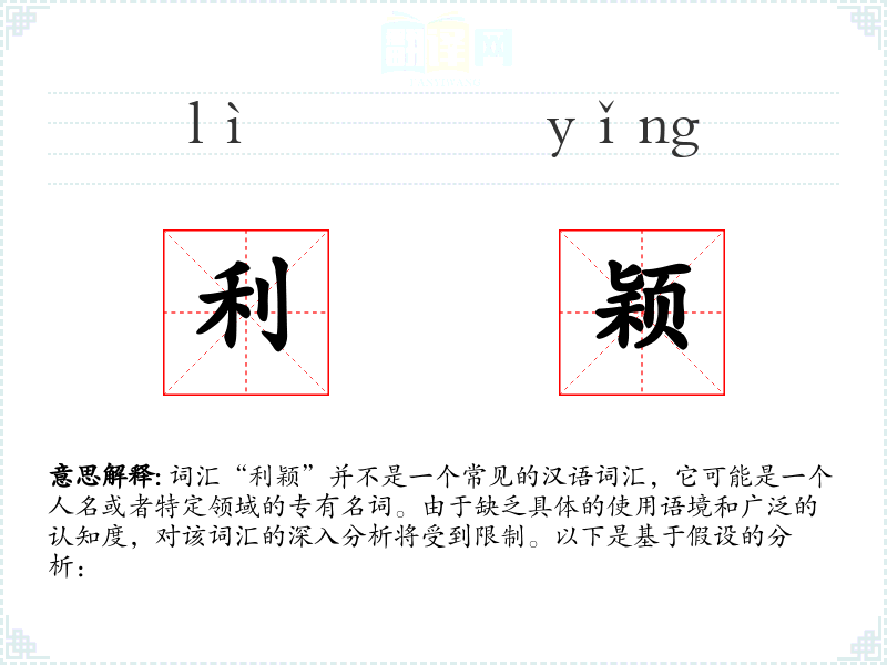 词汇“利颖”并不是一个常见的汉语词汇,它可能是一个人名或者特定领域的专有名词。由于缺乏具体的使用语境和广泛的认知度,对该词汇的深入分析将受到限制。以下是基于假设的分析: